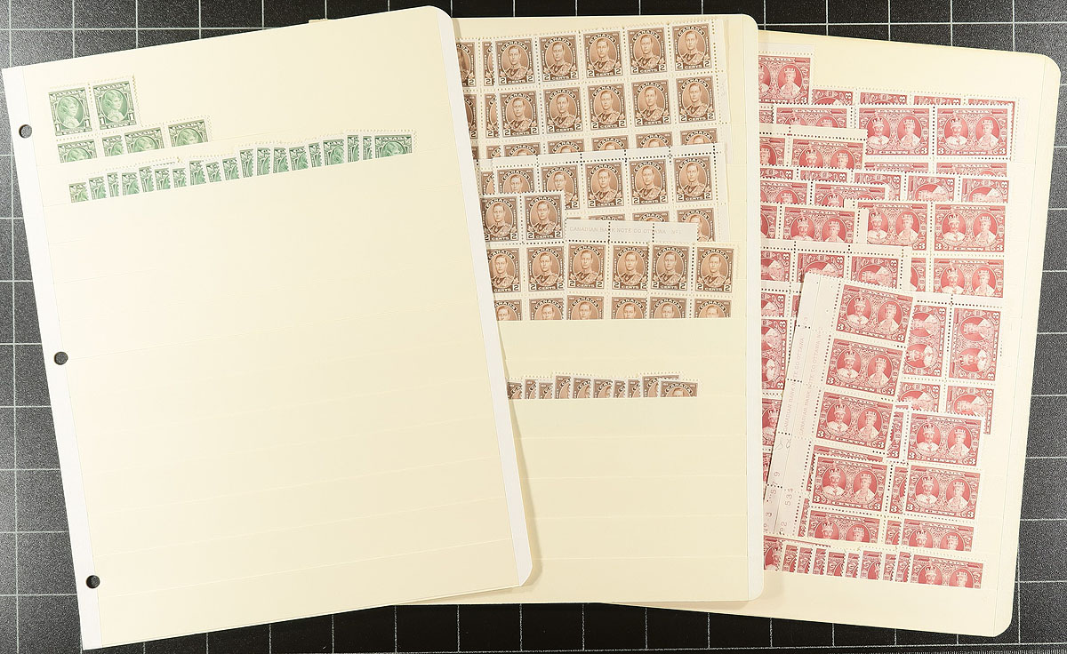 King George V and VI mint, never hinged, accumulation on manila stockpages. Lots of value here, starting with the 3c 1927 Jubilee, and noting 8c orange "Arch" (#172, 55 copies at $17.00 each), #194 (x4), #204 (20), some pairs of #210/210i, Silver Jubilees to 5c, Pictorials to 8c, KGVI "Muftis", War and Peace issues to 10c, with some later 1940's commemoratives and definitives. As well as having beautiful gum, most have been selected for having good centering. Thousands of dollars of catalogue value here. Estimate =