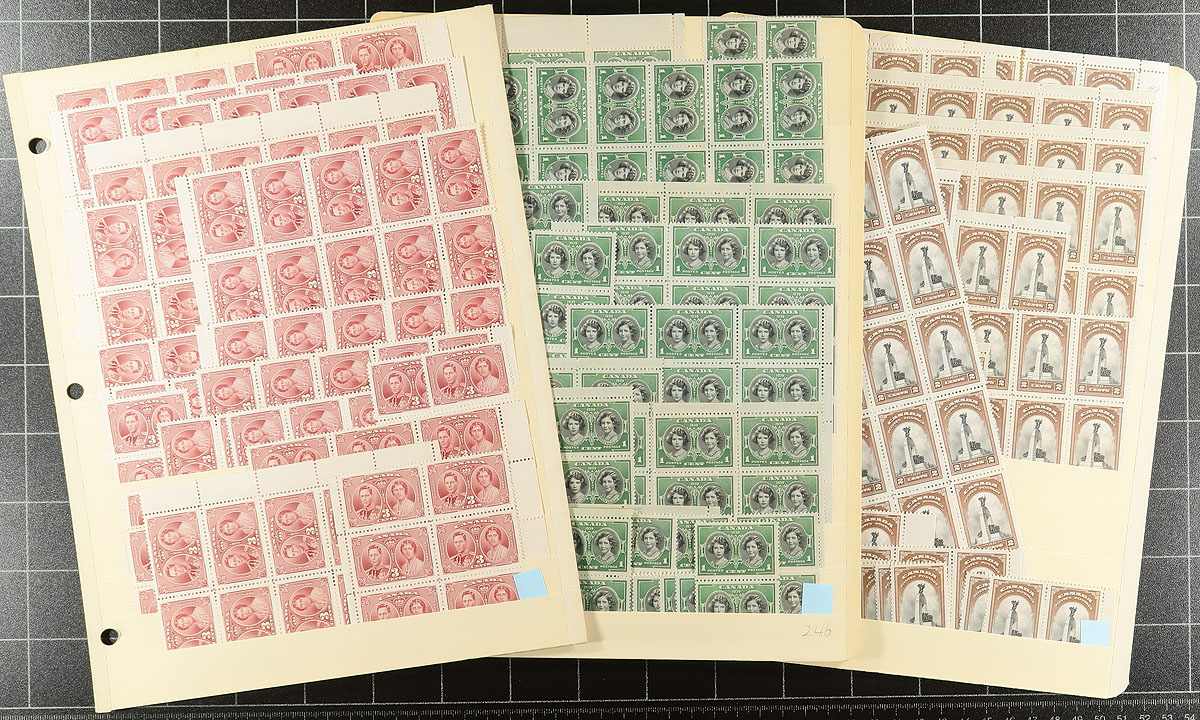King George V and VI mint, never hinged, accumulation on manila stockpages. Lots of value here, starting with the 3c 1927 Jubilee, and noting 8c orange "Arch" (#172, 55 copies at $17.00 each), #194 (x4), #204 (20), some pairs of #210/210i, Silver Jubilees to 5c, Pictorials to 8c, KGVI "Muftis", War and Peace issues to 10c, with some later 1940's commemoratives and definitives. As well as having beautiful gum, most have been selected for having good centering. Thousands of dollars of catalogue value here. Estimate =