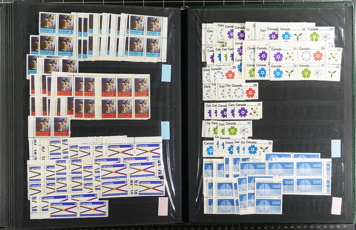 An accumulation/study of the "phosphor" or "tagged" stamps during the introduction of this technology from 1960-1972, with some differing paper types. All mint, never hinged, with some multiples (a few corner/plate blocks). Some Wilding, more Cameo, lots of Centennial (to the 25c), various Christmas (no centre blocks from 1970) plus commemoratives and the "Landscapes" issue (to 25c). Up to 100 of a type. The cherry on top is the magnificent 32-page dark green padded cover "Elephant" brand stockbook with black pages, acetate strips and acetate interleaves! Estimate =