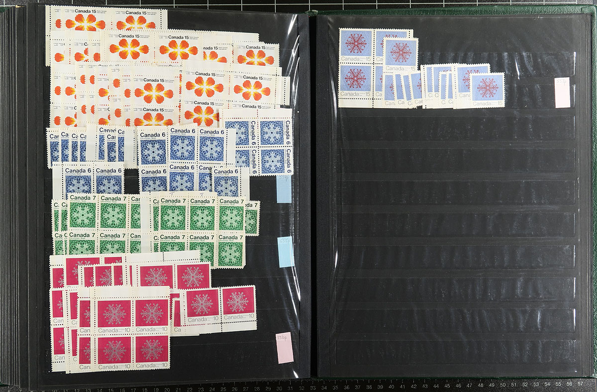 An accumulation/study of the "phosphor" or "tagged" stamps during the introduction of this technology from 1960-1972, with some differing paper types. All mint, never hinged, with some multiples (a few corner/plate blocks). Some Wilding, more Cameo, lots of Centennial (to the 25c), various Christmas (no centre blocks from 1970) plus commemoratives and the "Landscapes" issue (to 25c). Up to 100 of a type. The cherry on top is the magnificent 32-page dark green padded cover "Elephant" brand stockbook with black pages, acetate strips and acetate interleaves! Estimate =