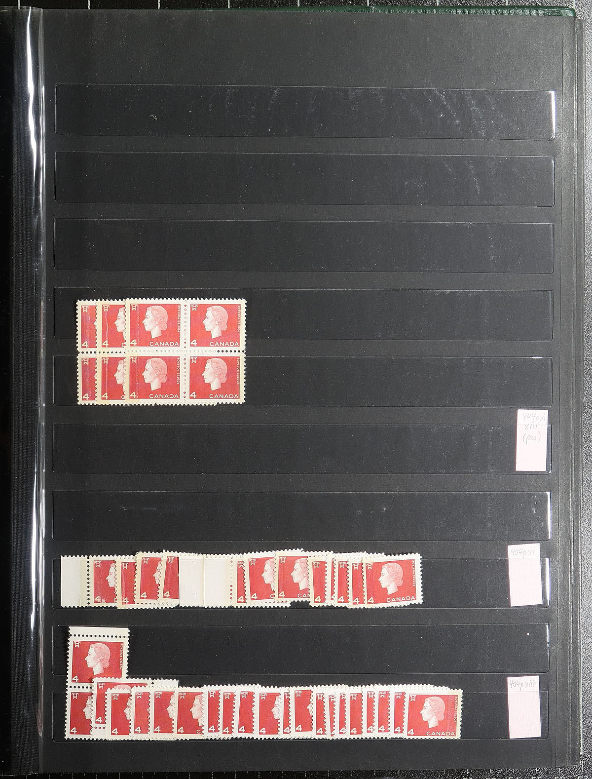 An accumulation/study of the "phosphor" or "tagged" stamps during the introduction of this technology from 1960-1972, with some differing paper types. All mint, never hinged, with some multiples (a few corner/plate blocks). Some Wilding, more Cameo, lots of Centennial (to the 25c), various Christmas (no centre blocks from 1970) plus commemoratives and the "Landscapes" issue (to 25c). Up to 100 of a type. The cherry on top is the magnificent 32-page dark green padded cover "Elephant" brand stockbook with black pages, acetate strips and acetate interleaves! Estimate =