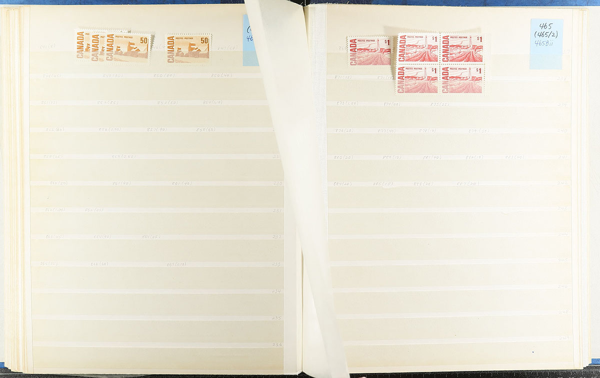 Late 1960's-early 1970's stock of paper variants (including "Hibrite", "dull") including tagging and precancels (unconfirmed by us, but the source does not give us worry). Sorted by Unitrade numbers, and quantities to over 200 per issue. All appear to be mint never hinged. Lots of catalogue value here. Housed in an older Lighthouse springback stock book with 15 pages/30 sides. Estimate =