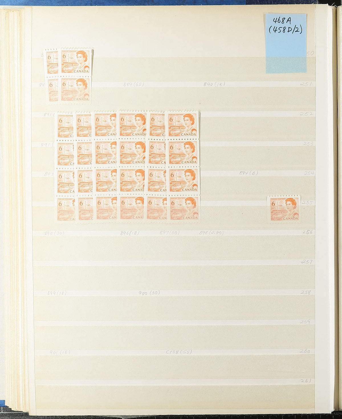 Late 1960's-early 1970's stock of paper variants (including "Hibrite", "dull") including tagging and precancels (unconfirmed by us, but the source does not give us worry). Sorted by Unitrade numbers, and quantities to over 200 per issue. All appear to be mint never hinged. Lots of catalogue value here. Housed in an older Lighthouse springback stock book with 15 pages/30 sides. Estimate =