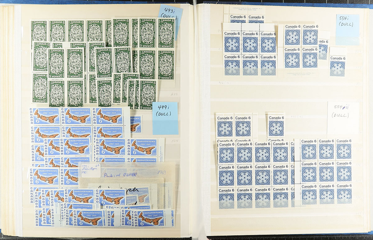Late 1960's-early 1970's stock of paper variants (including "Hibrite", "dull") including tagging and precancels (unconfirmed by us, but the source does not give us worry). Sorted by Unitrade numbers, and quantities to over 200 per issue. All appear to be mint never hinged. Lots of catalogue value here. Housed in an older Lighthouse springback stock book with 15 pages/30 sides. Estimate =