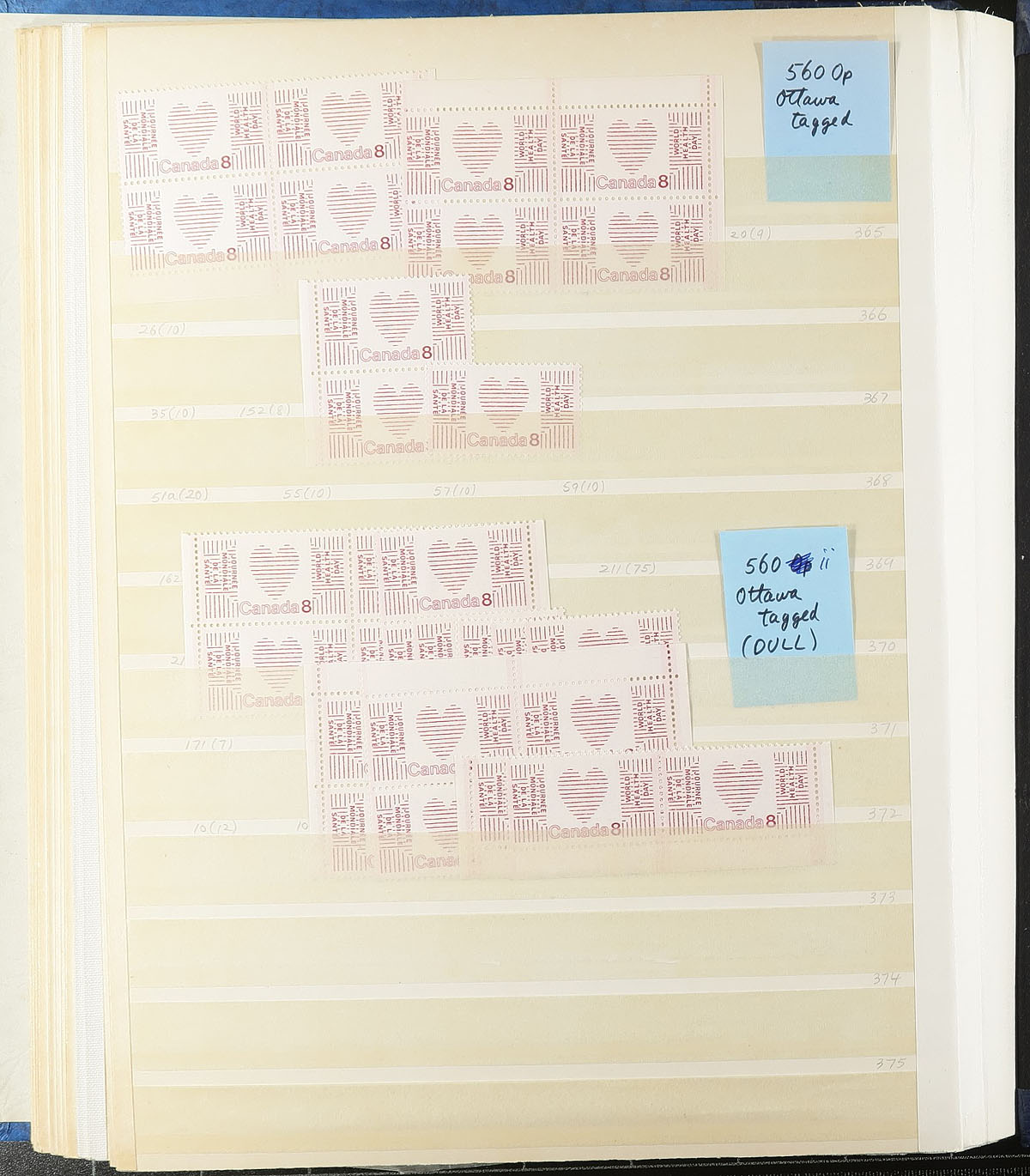 Late 1960's-early 1970's stock of paper variants (including "Hibrite", "dull") including tagging and precancels (unconfirmed by us, but the source does not give us worry). Sorted by Unitrade numbers, and quantities to over 200 per issue. All appear to be mint never hinged. Lots of catalogue value here. Housed in an older Lighthouse springback stock book with 15 pages/30 sides. Estimate =