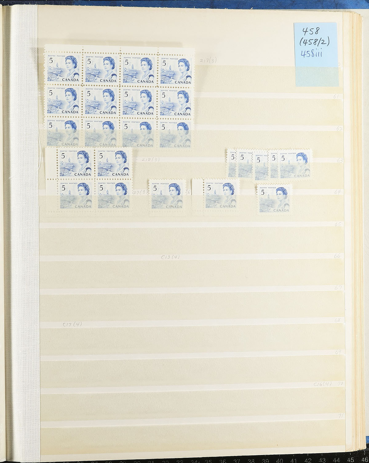 Late 1960's-early 1970's stock of paper variants (including "Hibrite", "dull") including tagging and precancels (unconfirmed by us, but the source does not give us worry). Sorted by Unitrade numbers, and quantities to over 200 per issue. All appear to be mint never hinged. Lots of catalogue value here. Housed in an older Lighthouse springback stock book with 15 pages/30 sides. Estimate =