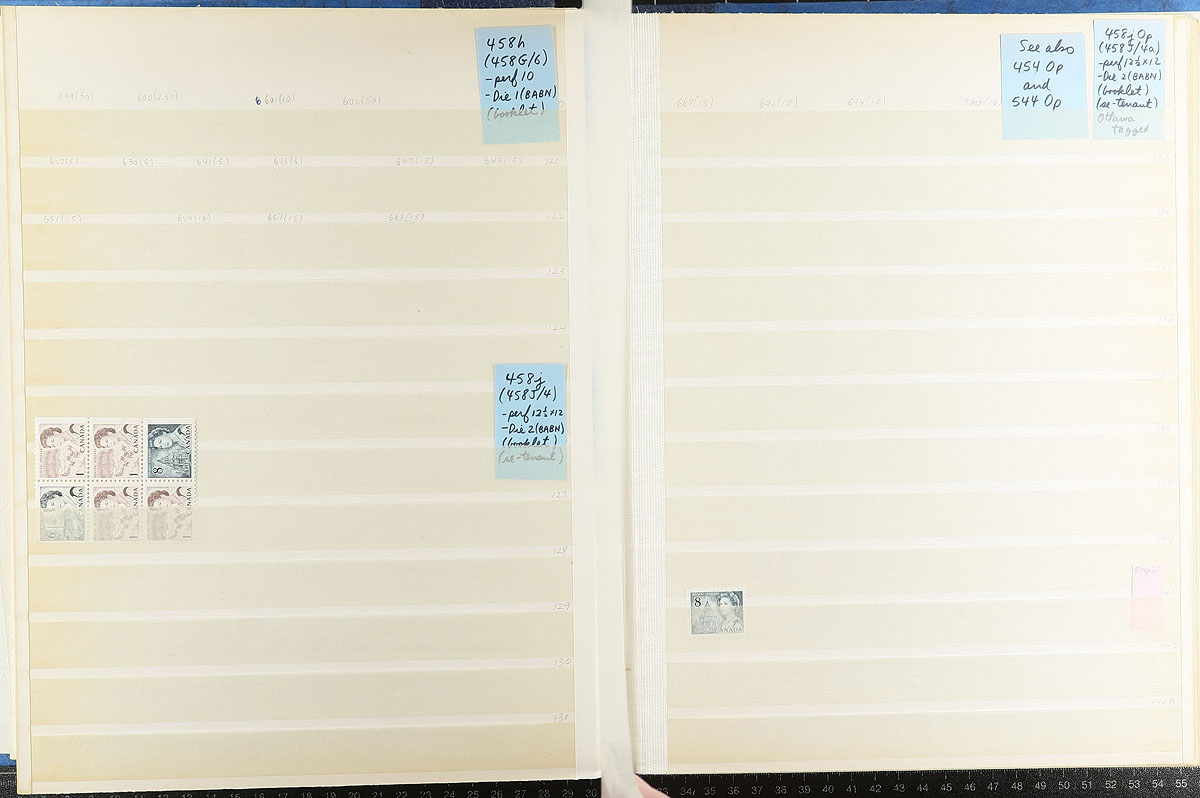 Late 1960's-early 1970's stock of paper variants (including "Hibrite", "dull") including tagging and precancels (unconfirmed by us, but the source does not give us worry). Sorted by Unitrade numbers, and quantities to over 200 per issue. All appear to be mint never hinged. Lots of catalogue value here. Housed in an older Lighthouse springback stock book with 15 pages/30 sides. Estimate =