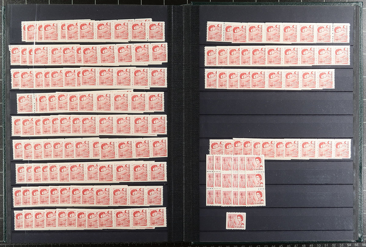 Coil pairs and strips of four from the King George VI "Mufti" issue up to the 4c QEII Centennial issue, in mint, never hinged, wholesale quantities, including a number of jump strips, and a 3c Cameo "paste-up" strip. The lot is a bit "hit or miss" with heavy quantities in some areas and light or none in others. We note lots of the War issue (perf 8 only) coils, with 10 strips of 4 of #300 (4c with "Postes Postage", cat $76.00 per strip). Outstanding quality and enormous catalogue value. In a lovely 48-page Lighthouse stockbook (acetate strips and interleaves). Estimate =