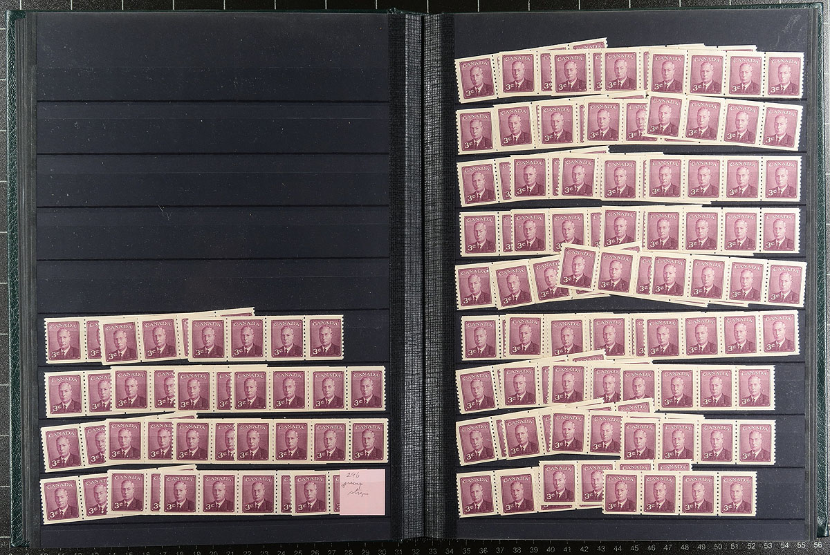 Coil pairs and strips of four from the King George VI "Mufti" issue up to the 4c QEII Centennial issue, in mint, never hinged, wholesale quantities, including a number of jump strips, and a 3c Cameo "paste-up" strip. The lot is a bit "hit or miss" with heavy quantities in some areas and light or none in others. We note lots of the War issue (perf 8 only) coils, with 10 strips of 4 of #300 (4c with "Postes Postage", cat $76.00 per strip). Outstanding quality and enormous catalogue value. In a lovely 48-page Lighthouse stockbook (acetate strips and interleaves). Estimate =