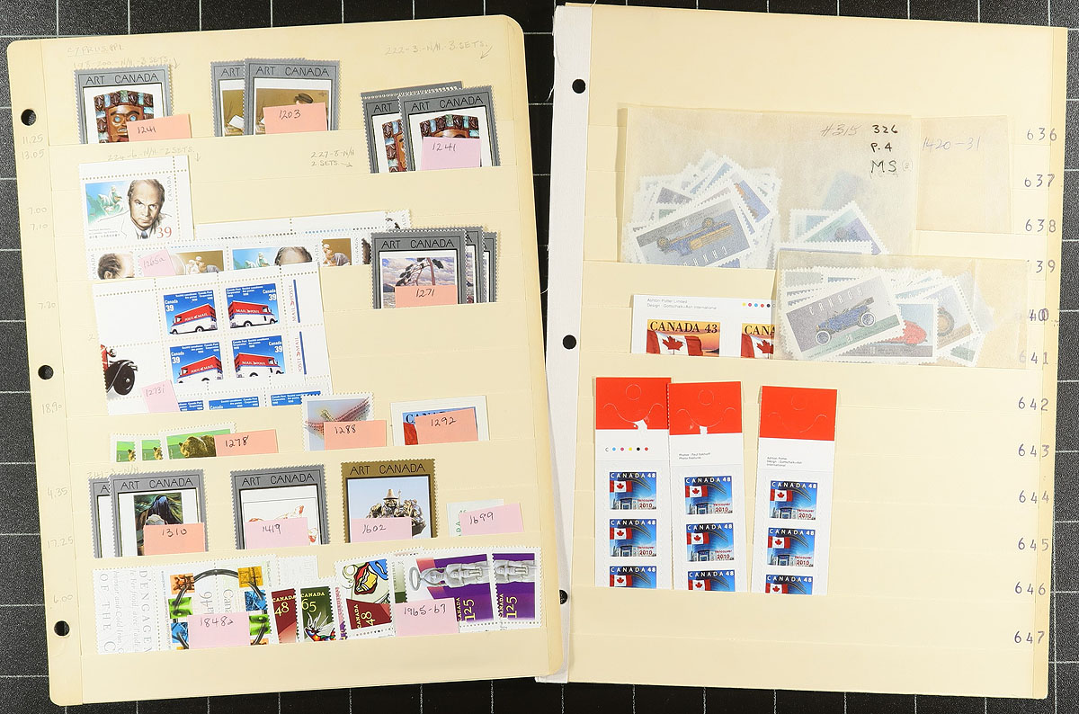 Mint Canada wholesale stock from the 1972" Landscape" issue into the 2000's. Hit of miss, with generally one issue per stockpage. Anywhere from 10 to a couple hundred stamps per page. Lots of multiples with relatively few plate blocks. A quick check indicates that most, if not all, are never hinged. From the mid-1970's, with over 100 of the $1 Vancouver (#600), and quantities of the Montreal Olympics $1 and $2 Sculptures and Buildings. More recently saw 75 copies of the 1982 $2 Commonwealth Day, 100 of the 36c QEII (#926A), plus some mammals (none of the key issues), etc. Enormous catalogue value here. Conservative face value =