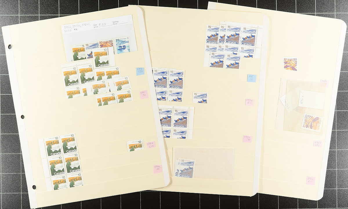 Mint Canada wholesale stock from the 1972" Landscape" issue into the 2000's. Hit of miss, with generally one issue per stockpage. Anywhere from 10 to a couple hundred stamps per page. Lots of multiples with relatively few plate blocks. A quick check indicates that most, if not all, are never hinged. From the mid-1970's, with over 100 of the $1 Vancouver (#600), and quantities of the Montreal Olympics $1 and $2 Sculptures and Buildings. More recently saw 75 copies of the 1982 $2 Commonwealth Day, 100 of the 36c QEII (#926A), plus some mammals (none of the key issues), etc. Enormous catalogue value here. Conservative face value =