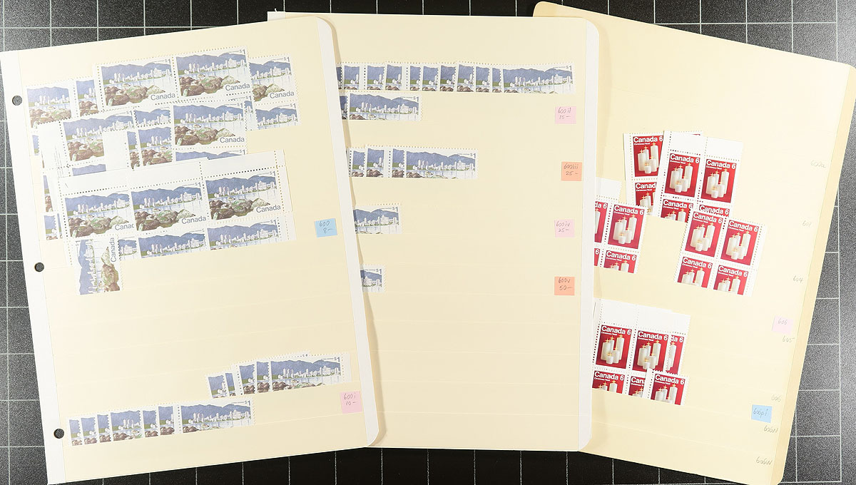 Mint Canada wholesale stock from the 1972" Landscape" issue into the 2000's. Hit of miss, with generally one issue per stockpage. Anywhere from 10 to a couple hundred stamps per page. Lots of multiples with relatively few plate blocks. A quick check indicates that most, if not all, are never hinged. From the mid-1970's, with over 100 of the $1 Vancouver (#600), and quantities of the Montreal Olympics $1 and $2 Sculptures and Buildings. More recently saw 75 copies of the 1982 $2 Commonwealth Day, 100 of the 36c QEII (#926A), plus some mammals (none of the key issues), etc. Enormous catalogue value here. Conservative face value =