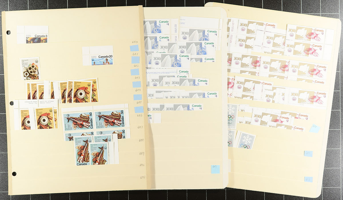 Mint Canada wholesale stock from the 1972" Landscape" issue into the 2000's. Hit of miss, with generally one issue per stockpage. Anywhere from 10 to a couple hundred stamps per page. Lots of multiples with relatively few plate blocks. A quick check indicates that most, if not all, are never hinged. From the mid-1970's, with over 100 of the $1 Vancouver (#600), and quantities of the Montreal Olympics $1 and $2 Sculptures and Buildings. More recently saw 75 copies of the 1982 $2 Commonwealth Day, 100 of the 36c QEII (#926A), plus some mammals (none of the key issues), etc. Enormous catalogue value here. Conservative face value =