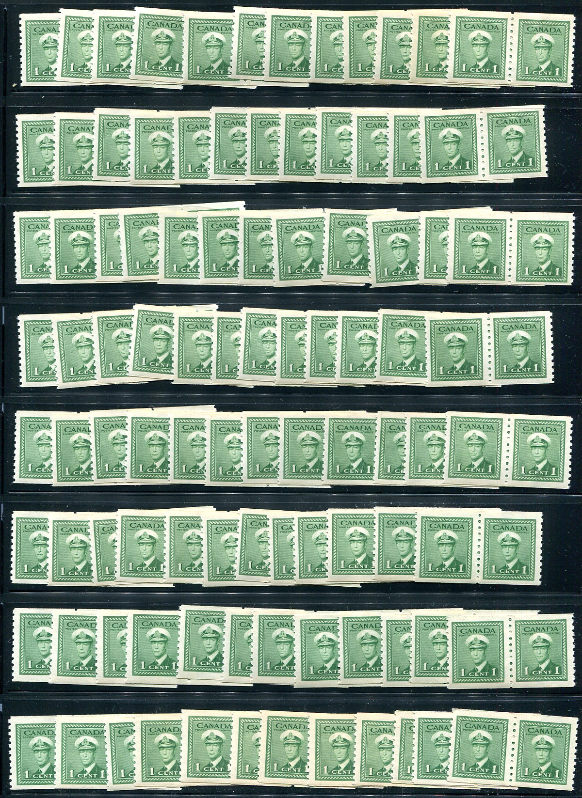 Three of the four denominations of the short-lived perf 9-1/2 "War" issue of 1948, in wholesale quantities of well-centred mint never hinged pairs. The 1c (#278 has 103 pairs), the 3c (#280, 5 pairs), and the 4c (#281, 13 pairs). No 2c values are present. 2024 Scott US$2035.00 =