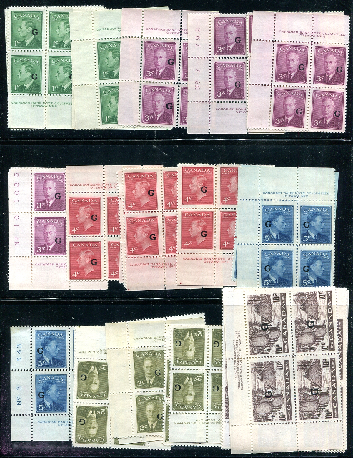 "G" overprinted official plate blocks from the late King George VI to early QEII era. An assortment of various plate numbers, positions (a few are matched sets), and the vast majority are never hinged, these came in from the estate of a collector who bought them new from the Post Office (a couple of damaged are not counted). These were not popular in their day, reflected in their catalogue value (noting #O18 - plate #10 set, #O20 - #3 - lower right, #O26 - plate 2 - matched set, etc. Both definitives and commemorative issues. All different. 2024 Unitrade =