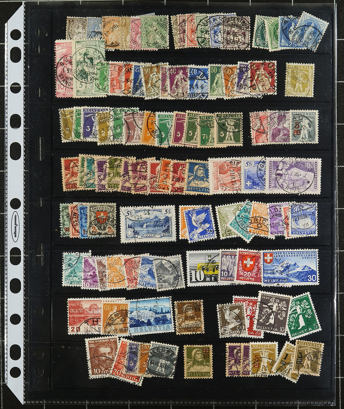 Collection / accumulation of used Switzerland, 1862-2008, containing roughly 950 stamps in several album or stock pages. The lot generally ranges from Scott #43/1318, with selections of back of the book material, and a stock page of revenues and a few documents. Owner's 2013 Scott catalogue value for the lot totals US$1,053.00 ($1421.55 CDN), leaving finds to the dedicated collector. Postmark interest includes CDS with several "socked on the nose" town cancels. A nice lot for the worldwide collector, with mild duplication for some issues, overall fine to very fine. Estimate =