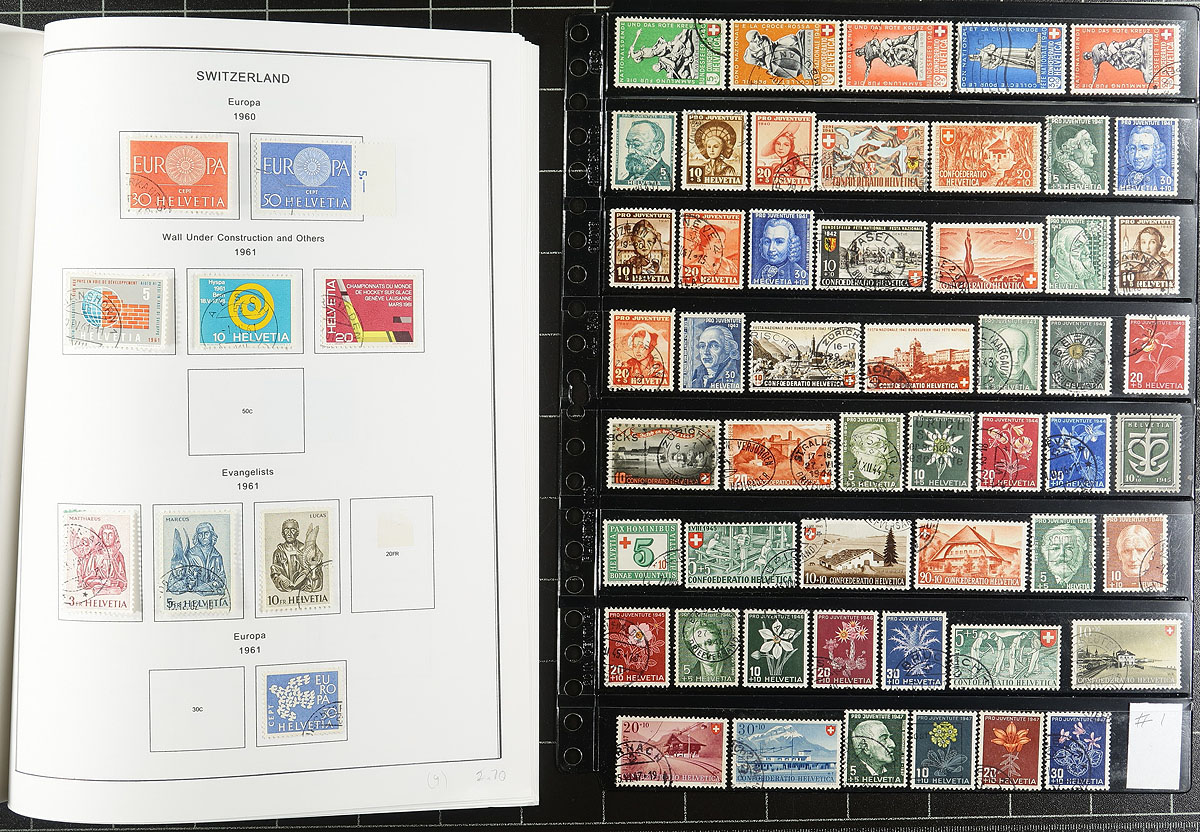 Collection / accumulation of used Switzerland, 1862-2008, containing roughly 950 stamps in several album or stock pages. The lot generally ranges from Scott #43/1318, with selections of back of the book material, and a stock page of revenues and a few documents. Owner's 2013 Scott catalogue value for the lot totals US$1,053.00 ($1421.55 CDN), leaving finds to the dedicated collector. Postmark interest includes CDS with several "socked on the nose" town cancels. A nice lot for the worldwide collector, with mild duplication for some issues, overall fine to very fine. Estimate =