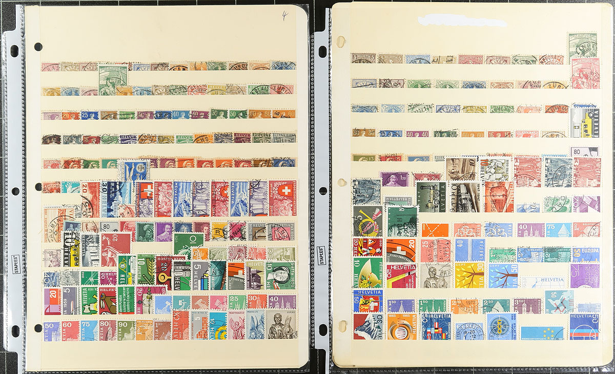 Collection / accumulation of used Switzerland, 1862-2008, containing roughly 950 stamps in several album or stock pages. The lot generally ranges from Scott #43/1318, with selections of back of the book material, and a stock page of revenues and a few documents. Owner's 2013 Scott catalogue value for the lot totals US$1,053.00 ($1421.55 CDN), leaving finds to the dedicated collector. Postmark interest includes CDS with several "socked on the nose" town cancels. A nice lot for the worldwide collector, with mild duplication for some issues, overall fine to very fine. Estimate =