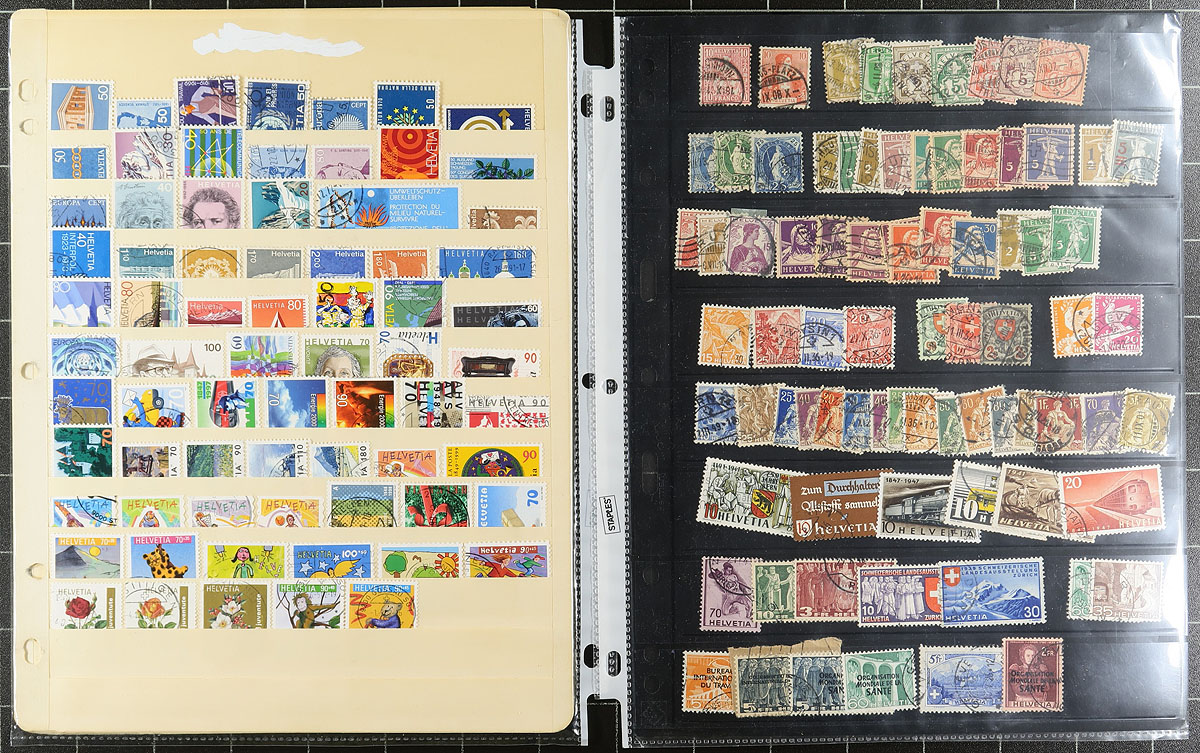 Collection / accumulation of used Switzerland, 1862-2008, containing roughly 950 stamps in several album or stock pages. The lot generally ranges from Scott #43/1318, with selections of back of the book material, and a stock page of revenues and a few documents. Owner's 2013 Scott catalogue value for the lot totals US$1,053.00 ($1421.55 CDN), leaving finds to the dedicated collector. Postmark interest includes CDS with several "socked on the nose" town cancels. A nice lot for the worldwide collector, with mild duplication for some issues, overall fine to very fine. Estimate =