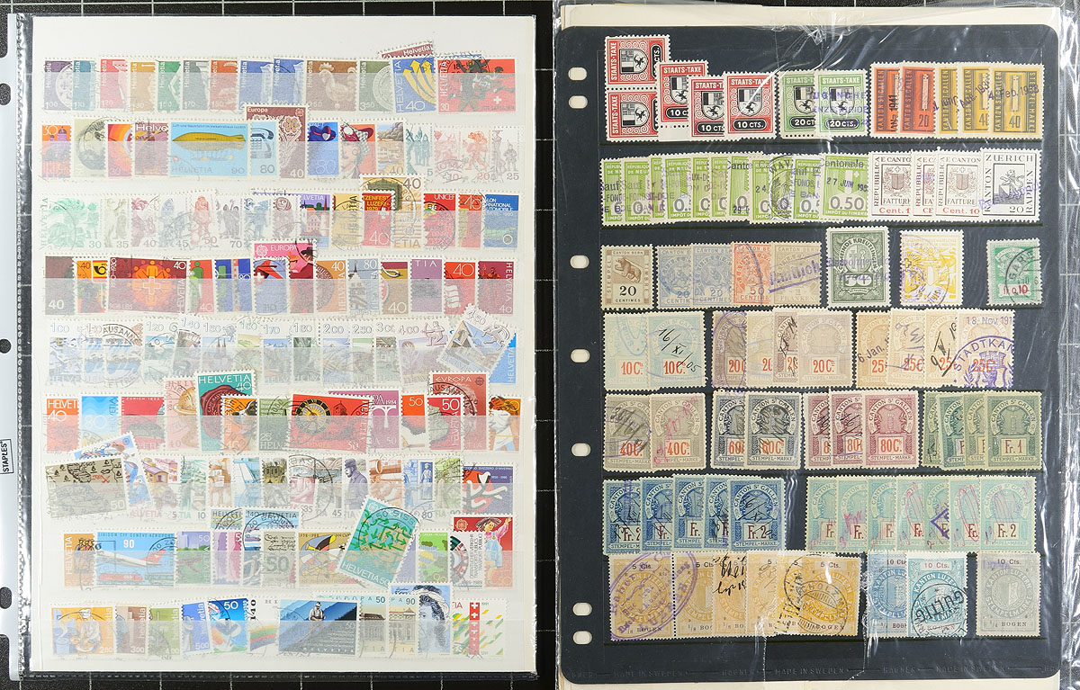 Collection / accumulation of used Switzerland, 1862-2008, containing roughly 950 stamps in several album or stock pages. The lot generally ranges from Scott #43/1318, with selections of back of the book material, and a stock page of revenues and a few documents. Owner's 2013 Scott catalogue value for the lot totals US$1,053.00 ($1421.55 CDN), leaving finds to the dedicated collector. Postmark interest includes CDS with several "socked on the nose" town cancels. A nice lot for the worldwide collector, with mild duplication for some issues, overall fine to very fine. Estimate =