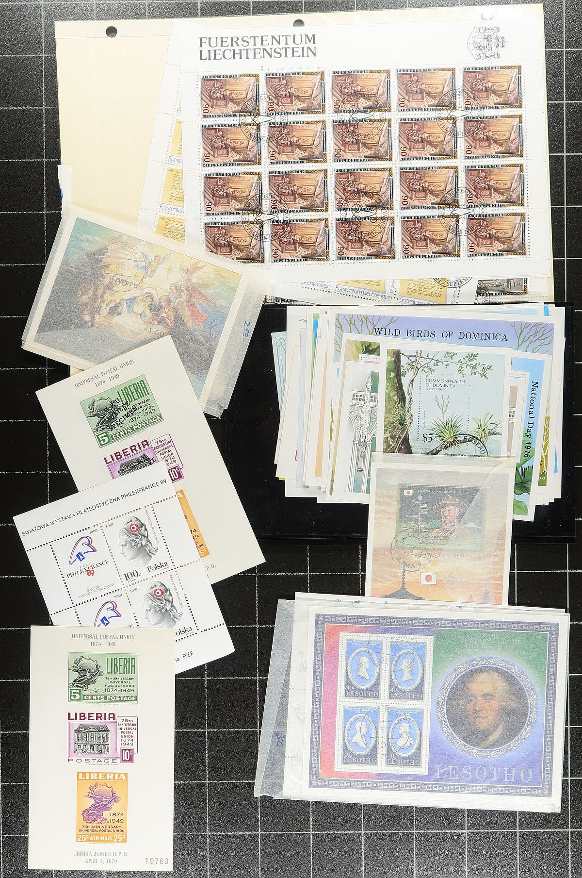 Lovely grouping of worldwide souvenir sheets and sheetlets, 1960's-2000's, containing roughly 150 items, primarily never hinged with a few having cto cancels. We note better representation from European countries (notably Belgium and Hungary), along with British Commonwealth material. A spot check indicated some items cataloguing $10 to $20 each, encountering several topical and thematic subjects. A nice lot for all collectors and dealers alike. Estimate =