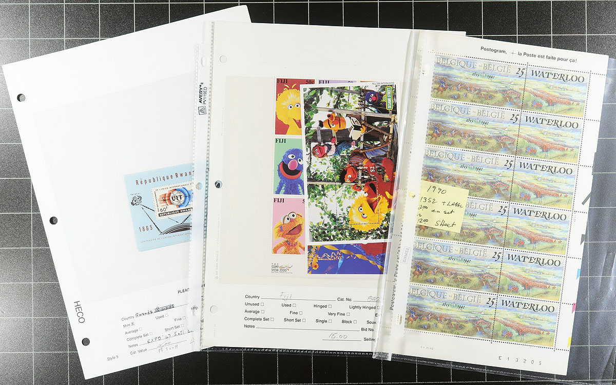 Lovely grouping of worldwide souvenir sheets and sheetlets, 1960's-2000's, containing roughly 150 items, primarily never hinged with a few having cto cancels. We note better representation from European countries (notably Belgium and Hungary), along with British Commonwealth material. A spot check indicated some items cataloguing $10 to $20 each, encountering several topical and thematic subjects. A nice lot for all collectors and dealers alike. Estimate =