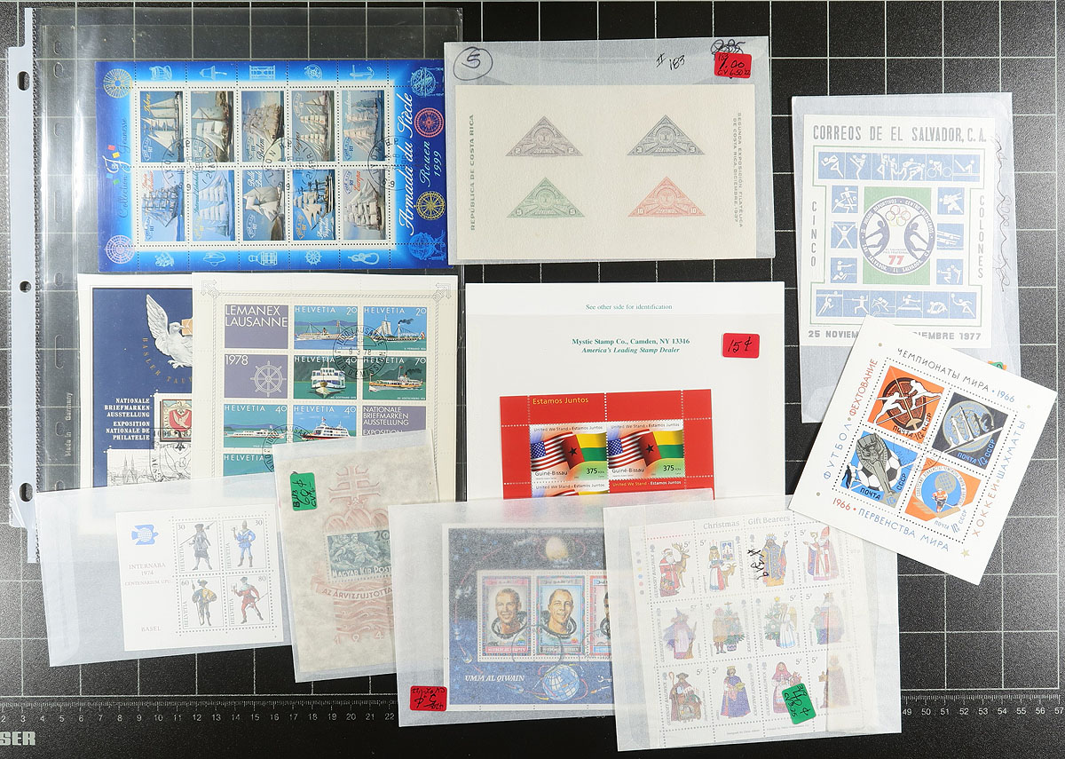 Lovely grouping of worldwide souvenir sheets and sheetlets, 1960's-2000's, containing roughly 150 items, primarily never hinged with a few having cto cancels. We note better representation from European countries (notably Belgium and Hungary), along with British Commonwealth material. A spot check indicated some items cataloguing $10 to $20 each, encountering several topical and thematic subjects. A nice lot for all collectors and dealers alike. Estimate =