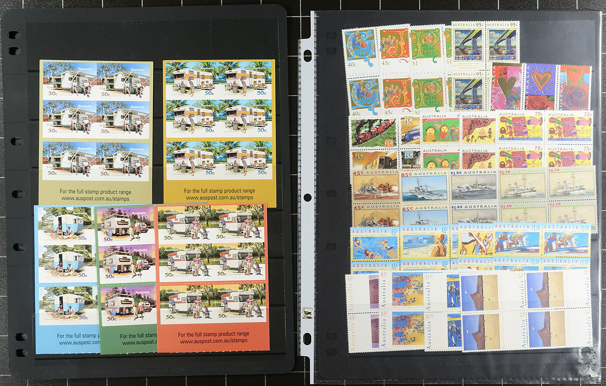 Lovely collection / accumulation of mint Australia, 1930's-2002, containing many hundreds of stamps in several stock pages. The lot generally ranges from Scott #147/2050a, noting singles, sets, partial sets, blocks and gutter blocks, booklets and panes, souvenir sheets, etc. A spot check indicated a few items cataloguing $10 and up including #147-149 (mh. $55 total), with owner's 2013 Scott catalogue value for the lot totaling $1,259.00 ($1699.55 CDN). Face value alone would be a few hundred dollars. A nice clean lot for collector and dealers alike, with a mix of hinged and never hinged material, clean and very fine. Estimate =