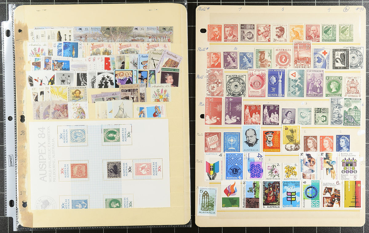 Lovely collection / accumulation of mint Australia, 1930's-2002, containing many hundreds of stamps in several stock pages. The lot generally ranges from Scott #147/2050a, noting singles, sets, partial sets, blocks and gutter blocks, booklets and panes, souvenir sheets, etc. A spot check indicated a few items cataloguing $10 and up including #147-149 (mh. $55 total), with owner's 2013 Scott catalogue value for the lot totaling $1,259.00 ($1699.55 CDN). Face value alone would be a few hundred dollars. A nice clean lot for collector and dealers alike, with a mix of hinged and never hinged material, clean and very fine. Estimate =