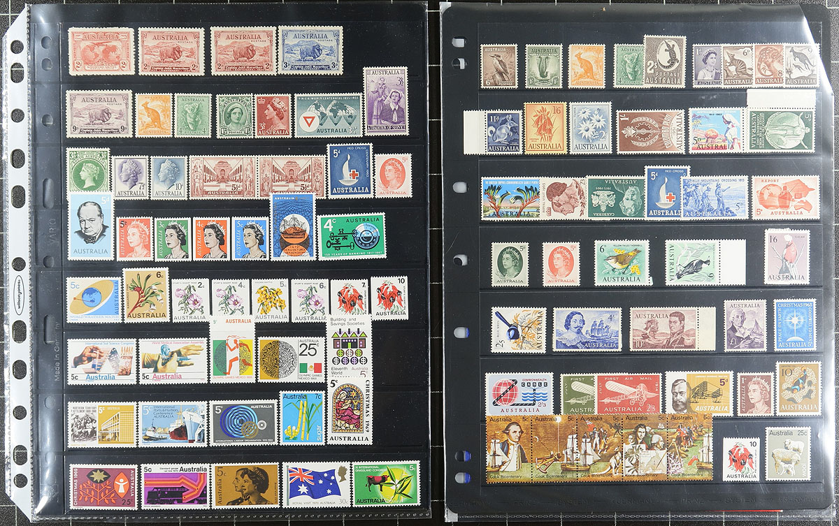 Lovely collection / accumulation of mint Australia, 1930's-2002, containing many hundreds of stamps in several stock pages. The lot generally ranges from Scott #147/2050a, noting singles, sets, partial sets, blocks and gutter blocks, booklets and panes, souvenir sheets, etc. A spot check indicated a few items cataloguing $10 and up including #147-149 (mh. $55 total), with owner's 2013 Scott catalogue value for the lot totaling $1,259.00 ($1699.55 CDN). Face value alone would be a few hundred dollars. A nice clean lot for collector and dealers alike, with a mix of hinged and never hinged material, clean and very fine. Estimate =