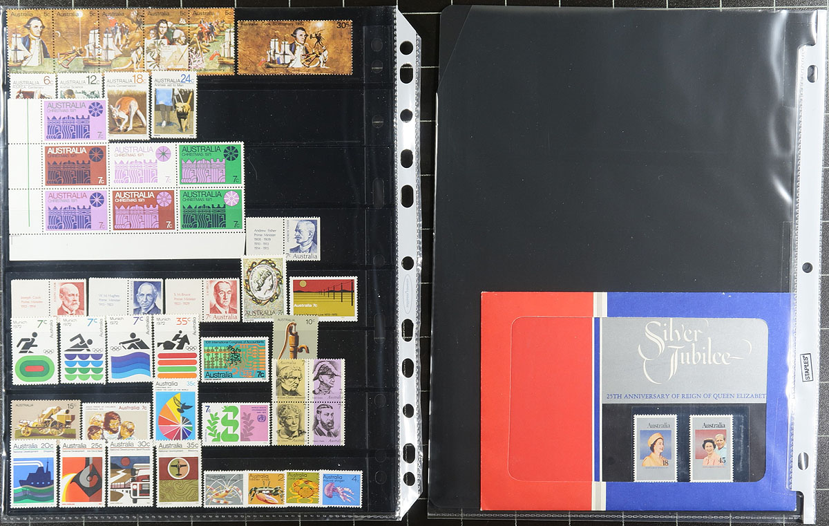 Lovely collection / accumulation of mint Australia, 1930's-2002, containing many hundreds of stamps in several stock pages. The lot generally ranges from Scott #147/2050a, noting singles, sets, partial sets, blocks and gutter blocks, booklets and panes, souvenir sheets, etc. A spot check indicated a few items cataloguing $10 and up including #147-149 (mh. $55 total), with owner's 2013 Scott catalogue value for the lot totaling $1,259.00 ($1699.55 CDN). Face value alone would be a few hundred dollars. A nice clean lot for collector and dealers alike, with a mix of hinged and never hinged material, clean and very fine. Estimate =