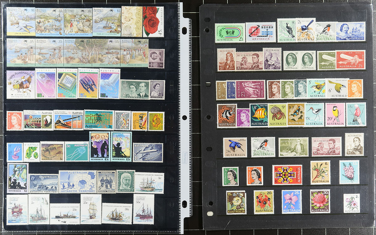 Lovely collection / accumulation of mint Australia, 1930's-2002, containing many hundreds of stamps in several stock pages. The lot generally ranges from Scott #147/2050a, noting singles, sets, partial sets, blocks and gutter blocks, booklets and panes, souvenir sheets, etc. A spot check indicated a few items cataloguing $10 and up including #147-149 (mh. $55 total), with owner's 2013 Scott catalogue value for the lot totaling $1,259.00 ($1699.55 CDN). Face value alone would be a few hundred dollars. A nice clean lot for collector and dealers alike, with a mix of hinged and never hinged material, clean and very fine. Estimate =