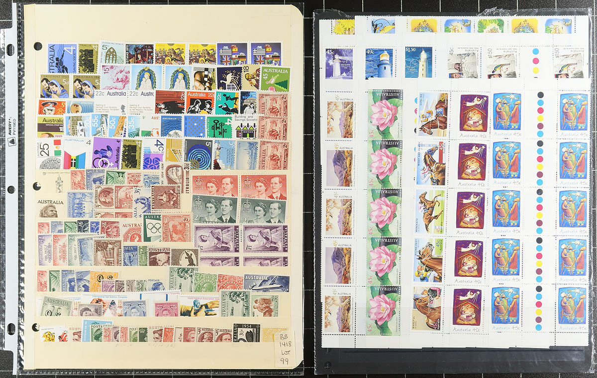 Lovely collection / accumulation of mint Australia, 1930's-2002, containing many hundreds of stamps in several stock pages. The lot generally ranges from Scott #147/2050a, noting singles, sets, partial sets, blocks and gutter blocks, booklets and panes, souvenir sheets, etc. A spot check indicated a few items cataloguing $10 and up including #147-149 (mh. $55 total), with owner's 2013 Scott catalogue value for the lot totaling $1,259.00 ($1699.55 CDN). Face value alone would be a few hundred dollars. A nice clean lot for collector and dealers alike, with a mix of hinged and never hinged material, clean and very fine. Estimate =
