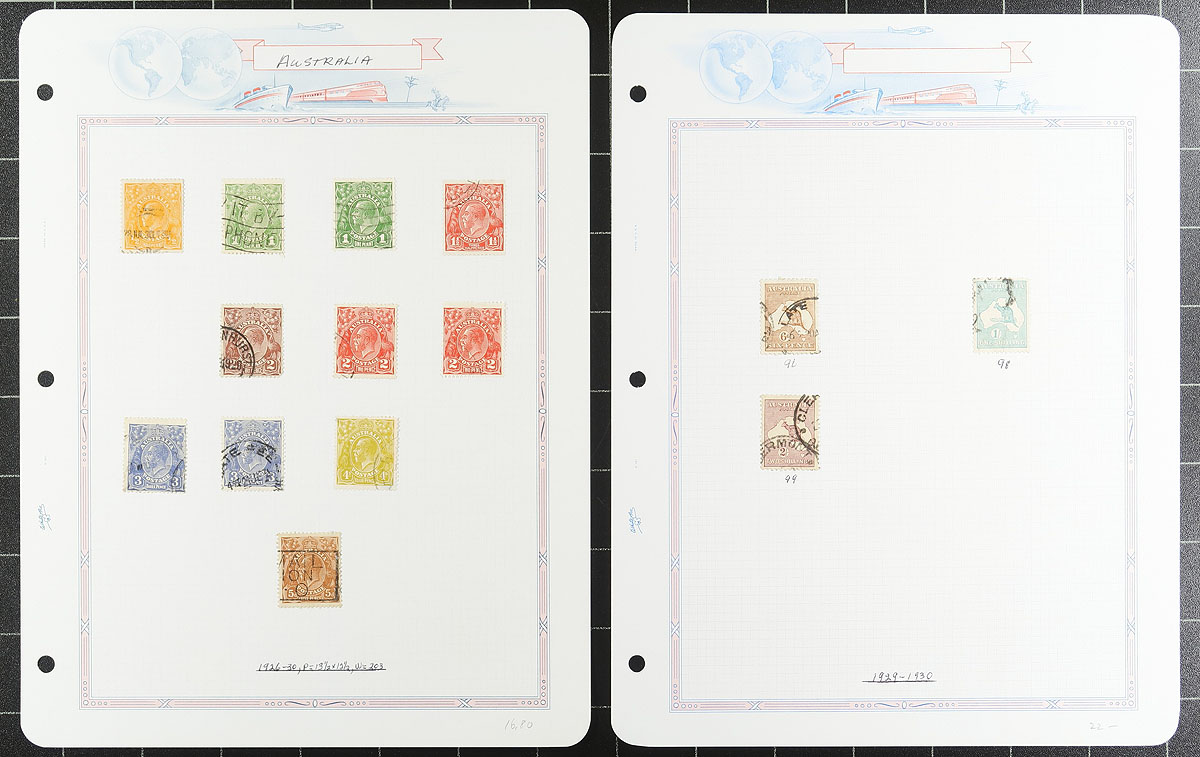 Nice collection / accumulation of used Australia, 1913-2006, containing roughly 1,500 stamps in an Australia Stamp album, and several loose stock or album pages. The lot ranges from Scott #1/2588, along with selections of back of the book material. We note several examples of Kangaroos and KGV Heads, along with some singles and sets cataloguing $10 and up. Owner's 2013 catalogue value for the lot totaling US$2,023.00 ($2731.05 CDN), leaving better finds to the dedicated collector. Some mild duplication throughout, noting a few small faults on a few of the early issues, overall fine to very fine. Estimate =