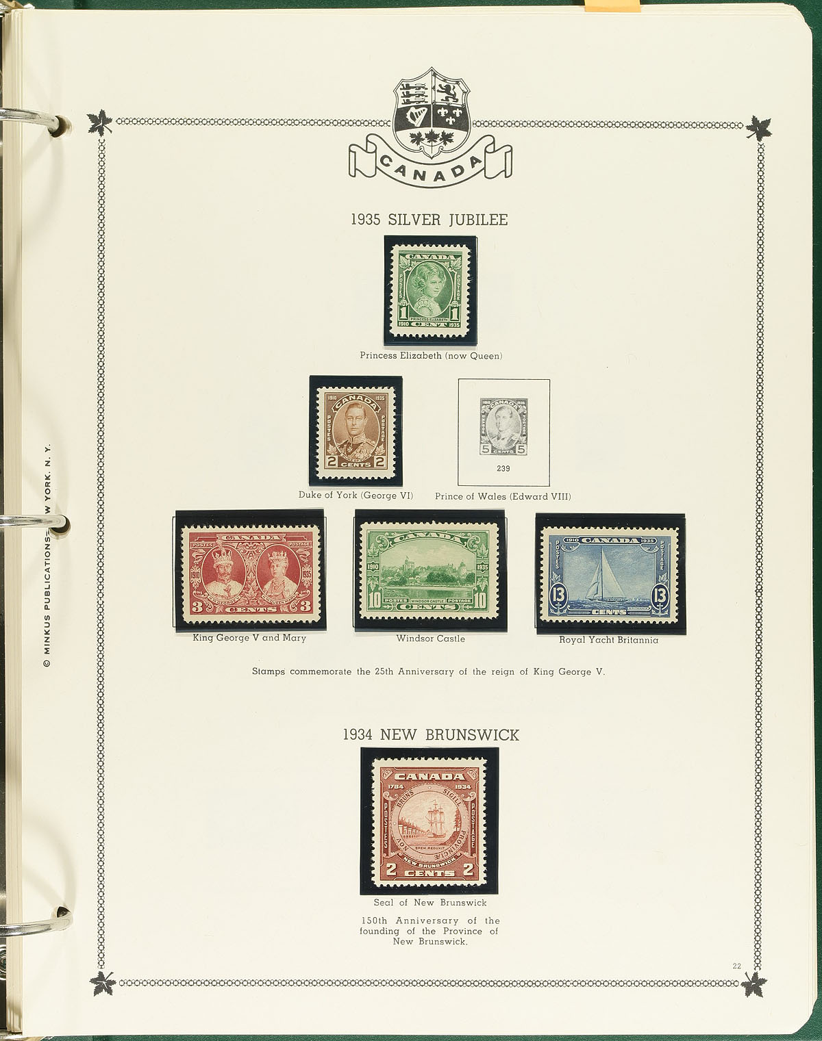 Collection mint Canada containing a few hundred stamps in two Minkus albums, 1897-1971. The collection ranges from Scott #50/553, along with small selections of back of the book issues, and some Newfoundland stamps. The collection begins with a few Jubilees (1/2c, 8c, 10c, 15c, all with gum disturbance), and continues with scattered mint in hingeless mounts up to the 1950's, and fills out up to 1971. We note a few stamps cataloguing $10.00 and up including Maps #85-86 (mh, $85.00 total), a few low denomination Quebecs, Admiral coils, $1.00 Cavell (gum disturbance), among a few others. The collection also includes a handful of generally post 1920 Newfoundland issues. A nicely organized starter mint collection, with pages for issues ranging from 1851 to 1989 (includes spots for souvenir sheets and booklets), and should be filled out by Canada collectors. Estimate =