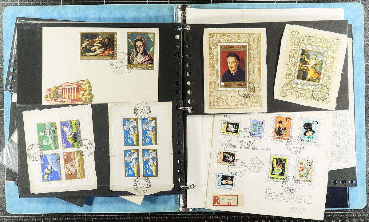 Accumulation of many thousands of worldwide stamps in a banker's box. A spot check revealed a variety of formats including stockbooks of various sizes, album pages, glassines, etc, noting Scandinavia, European, and Asian countries, generally ranging from 1900 to the 1990's. A good lot, with a "who knows" what one will find, and ideal for the worldwide collector and patient sorter, overall fine to very fine. Estimate =