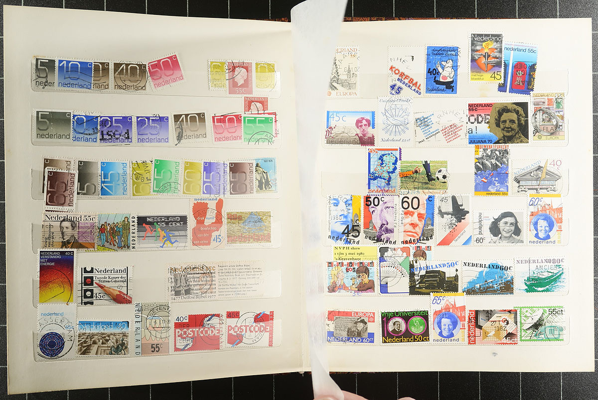 Accumulation of many thousands of worldwide stamps in a banker's box. A spot check revealed a variety of formats including stockbooks of various sizes, album pages, glassines, etc, noting Scandinavia, European, and Asian countries, generally ranging from 1900 to the 1990's. A good lot, with a "who knows" what one will find, and ideal for the worldwide collector and patient sorter, overall fine to very fine. Estimate =
