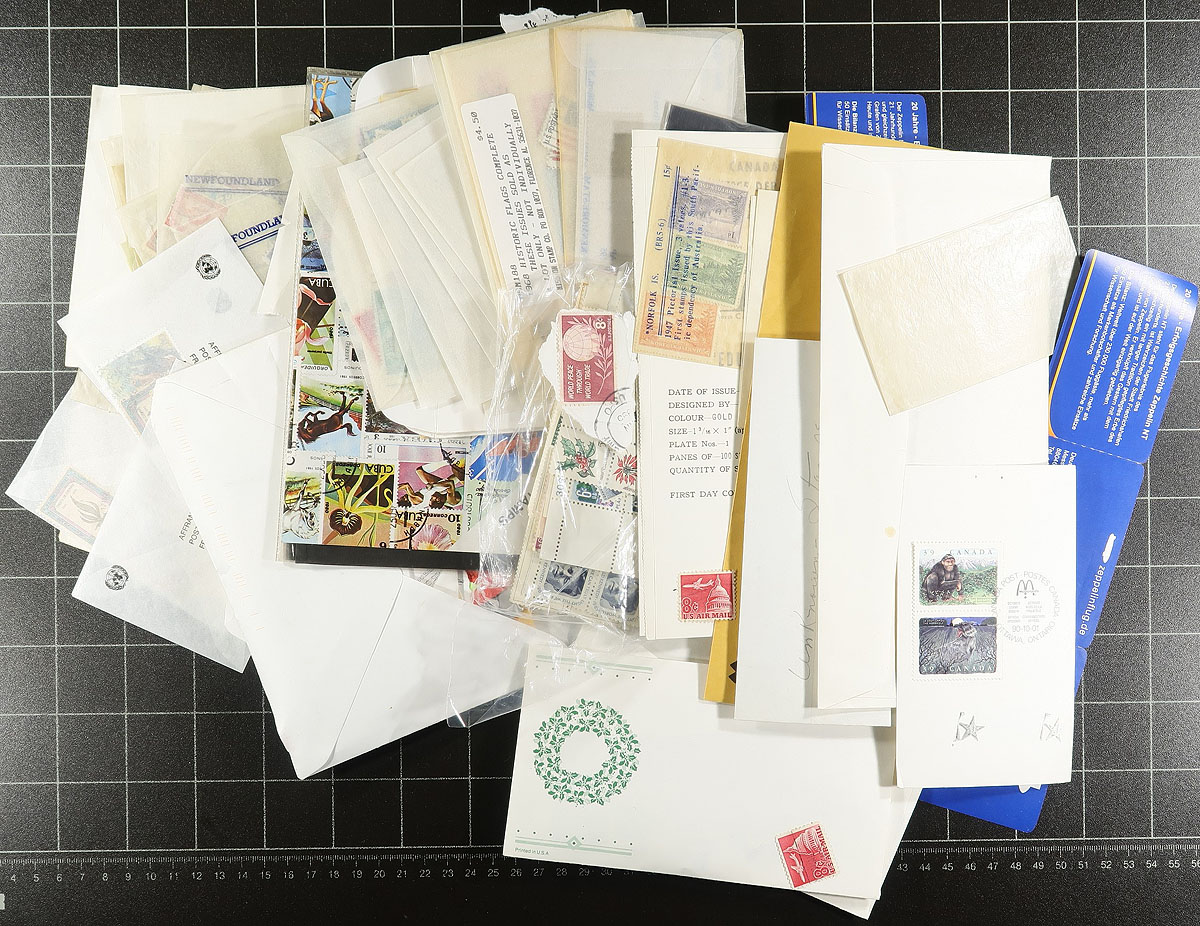 Accumulation of many thousands of worldwide stamps in a banker's box. A spot check revealed a variety of formats including stockbooks of various sizes, album pages, glassines, etc, noting Scandinavia, European, and Asian countries, generally ranging from 1900 to the 1990's. A good lot, with a "who knows" what one will find, and ideal for the worldwide collector and patient sorter, overall fine to very fine. Estimate =