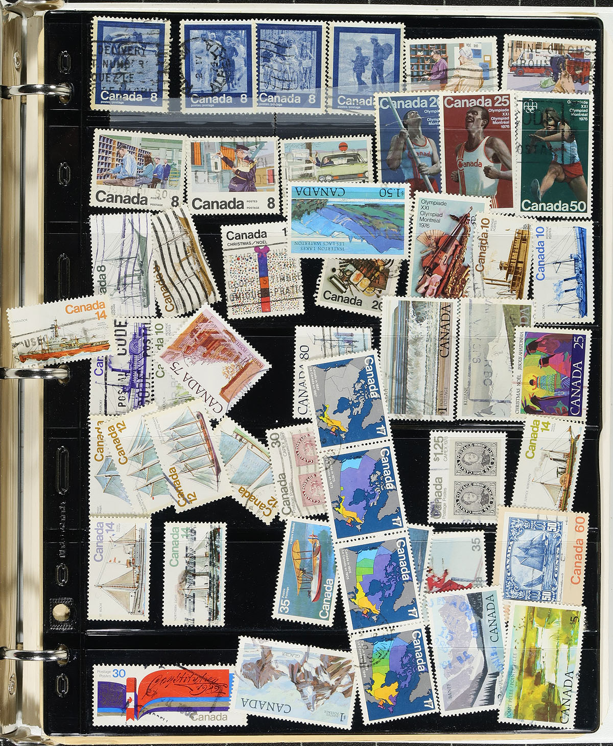 Large accumulation of primarily used Canada stuffing a banker's box, 1870's-1990's. This interesting lot contains thousands of stamps in a variety of formats, including a few albums, over 100 album pages, stamps on and off paper in 2 boxes, and some loose material. A spot check revealed several classic stamps from the Small Queens up to the 1940's (many well organized on album pages), Elizabethan mint and used (including several mint plate blocks), back of the book issues, and surely more. We estimate $50 to $75 of usable face value postage, and a nice lot for the postmark hunter as we encountered several "socked on the nose" town cancels. A nice lot with possible finds for the dedicated collector, overall fine to very fine. Estimate =