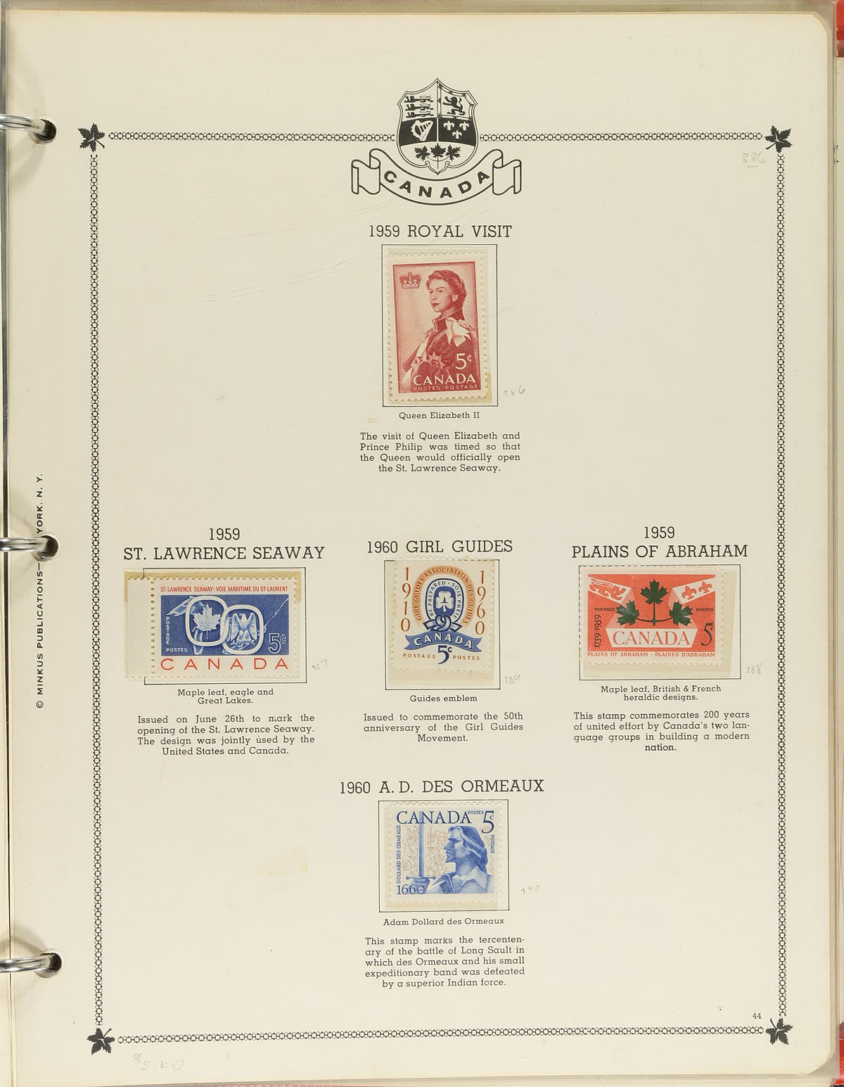 Large accumulation of primarily used Canada stuffing a banker's box, 1870's-1990's. This interesting lot contains thousands of stamps in a variety of formats, including a few albums, over 100 album pages, stamps on and off paper in 2 boxes, and some loose material. A spot check revealed several classic stamps from the Small Queens up to the 1940's (many well organized on album pages), Elizabethan mint and used (including several mint plate blocks), back of the book issues, and surely more. We estimate $50 to $75 of usable face value postage, and a nice lot for the postmark hunter as we encountered several "socked on the nose" town cancels. A nice lot with possible finds for the dedicated collector, overall fine to very fine. Estimate =