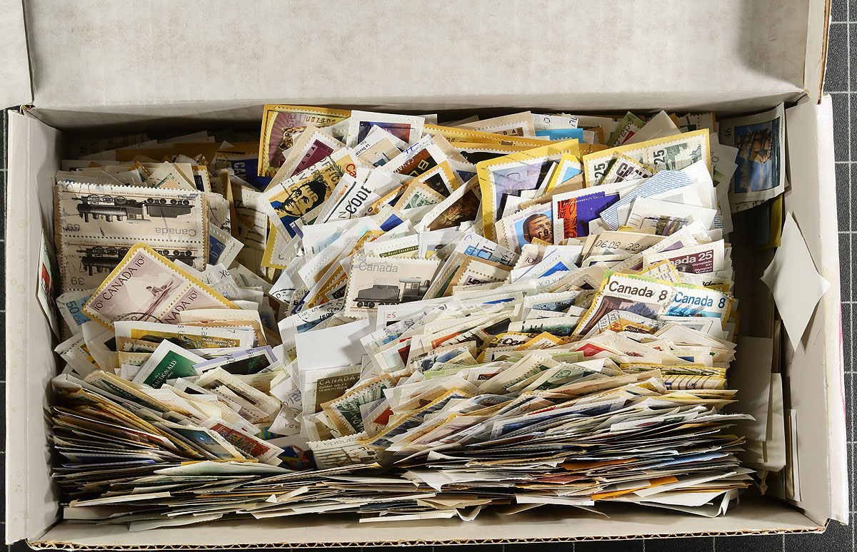 Large accumulation of primarily used Canada stuffing a banker's box, 1870's-1990's. This interesting lot contains thousands of stamps in a variety of formats, including a few albums, over 100 album pages, stamps on and off paper in 2 boxes, and some loose material. A spot check revealed several classic stamps from the Small Queens up to the 1940's (many well organized on album pages), Elizabethan mint and used (including several mint plate blocks), back of the book issues, and surely more. We estimate $50 to $75 of usable face value postage, and a nice lot for the postmark hunter as we encountered several "socked on the nose" town cancels. A nice lot with possible finds for the dedicated collector, overall fine to very fine. Estimate =