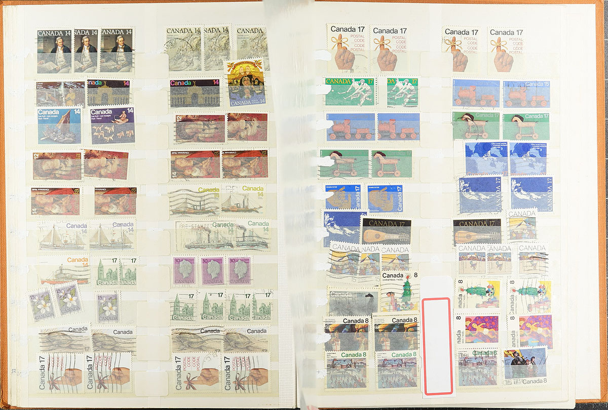 Large accumulation of primarily used Canada stuffing a banker's box, 1870's-1990's. This interesting lot contains thousands of stamps in a variety of formats, including a few albums, over 100 album pages, stamps on and off paper in 2 boxes, and some loose material. A spot check revealed several classic stamps from the Small Queens up to the 1940's (many well organized on album pages), Elizabethan mint and used (including several mint plate blocks), back of the book issues, and surely more. We estimate $50 to $75 of usable face value postage, and a nice lot for the postmark hunter as we encountered several "socked on the nose" town cancels. A nice lot with possible finds for the dedicated collector, overall fine to very fine. Estimate =