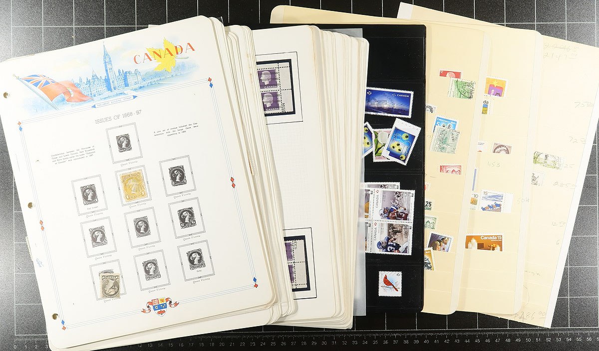 Large accumulation of primarily used Canada stuffing a banker's box, 1870's-1990's. This interesting lot contains thousands of stamps in a variety of formats, including a few albums, over 100 album pages, stamps on and off paper in 2 boxes, and some loose material. A spot check revealed several classic stamps from the Small Queens up to the 1940's (many well organized on album pages), Elizabethan mint and used (including several mint plate blocks), back of the book issues, and surely more. We estimate $50 to $75 of usable face value postage, and a nice lot for the postmark hunter as we encountered several "socked on the nose" town cancels. A nice lot with possible finds for the dedicated collector, overall fine to very fine. Estimate =