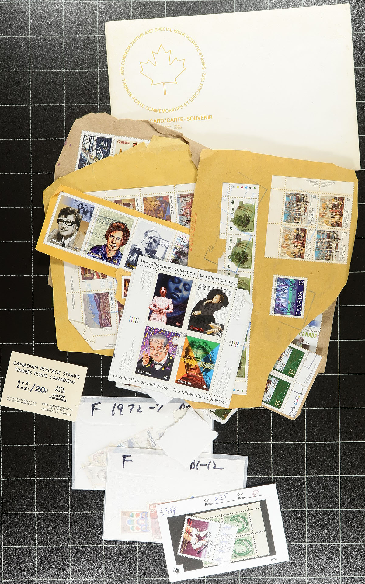 Large accumulation of primarily used Canada stuffing a banker's box, 1870's-1990's. This interesting lot contains thousands of stamps in a variety of formats, including a few albums, over 100 album pages, stamps on and off paper in 2 boxes, and some loose material. A spot check revealed several classic stamps from the Small Queens up to the 1940's (many well organized on album pages), Elizabethan mint and used (including several mint plate blocks), back of the book issues, and surely more. We estimate $50 to $75 of usable face value postage, and a nice lot for the postmark hunter as we encountered several "socked on the nose" town cancels. A nice lot with possible finds for the dedicated collector, overall fine to very fine. Estimate =