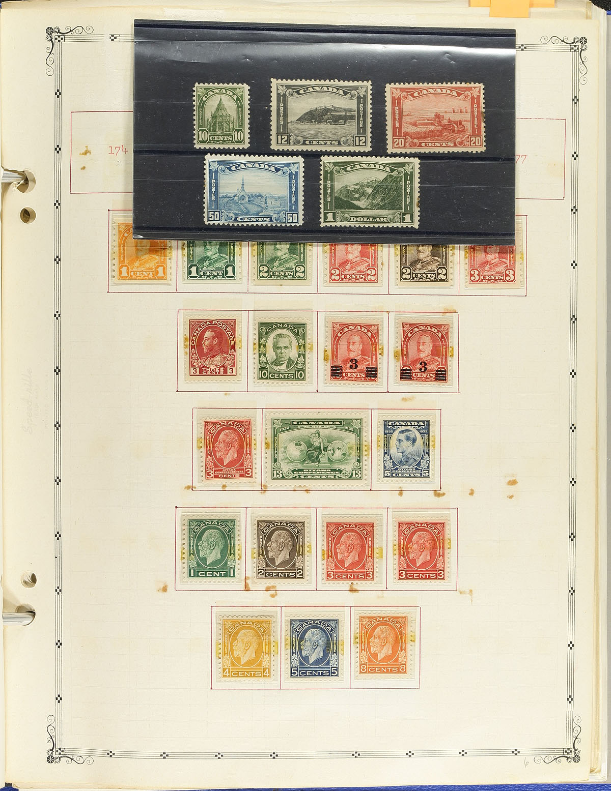 Interesting collection of primarily mint Canada, 1859-1997. The collection ranges from Scott #15/1154, with a selection of used material up to the Admirals, noting #s 15, 29, 20c and 50c (x2) Widow Weeds. The mint material contains singles, sets, and partial sets from the Jubilees onward and includes 5c and 15c Quebecs, Admiral coil singles, complete set of Arch, 1935 and 1938 Pictorials, Medallion, War and Peace issues. Unfortunately, the stamps are in older crystal mounts and a removal test of a few stamps (now seen in black mounts on pages), show varying degrees of staining on the perforations (very light to noticeable). The collection is virtually complete from the 1950's to the 1980's, with roughly $125.00 to $150.00 of usable face value stamps. Still a good collection for Canada collectors, overall fine to very fine. Estimate =