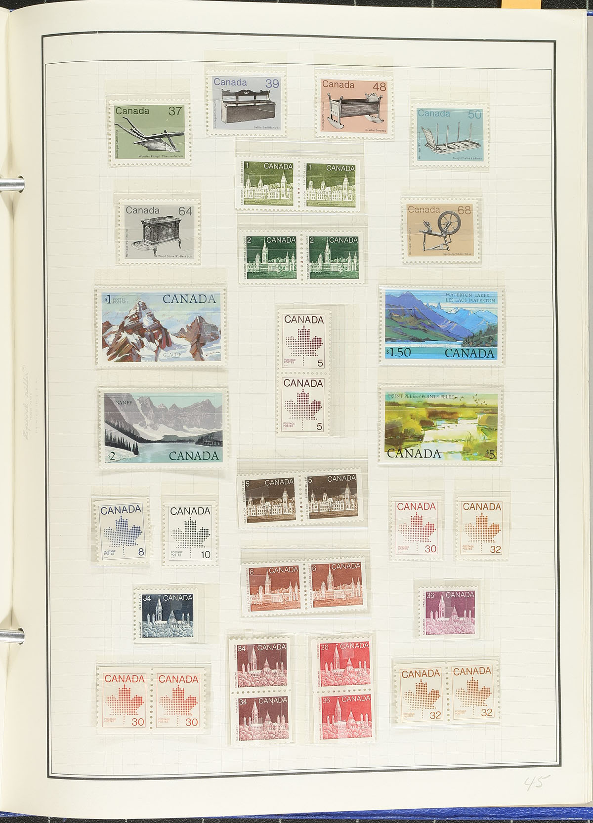 Interesting collection of primarily mint Canada, 1859-1997. The collection ranges from Scott #15/1154, with a selection of used material up to the Admirals, noting #s 15, 29, 20c and 50c (x2) Widow Weeds. The mint material contains singles, sets, and partial sets from the Jubilees onward and includes 5c and 15c Quebecs, Admiral coil singles, complete set of Arch, 1935 and 1938 Pictorials, Medallion, War and Peace issues. Unfortunately, the stamps are in older crystal mounts and a removal test of a few stamps (now seen in black mounts on pages), show varying degrees of staining on the perforations (very light to noticeable). The collection is virtually complete from the 1950's to the 1980's, with roughly $125.00 to $150.00 of usable face value stamps. Still a good collection for Canada collectors, overall fine to very fine. Estimate =