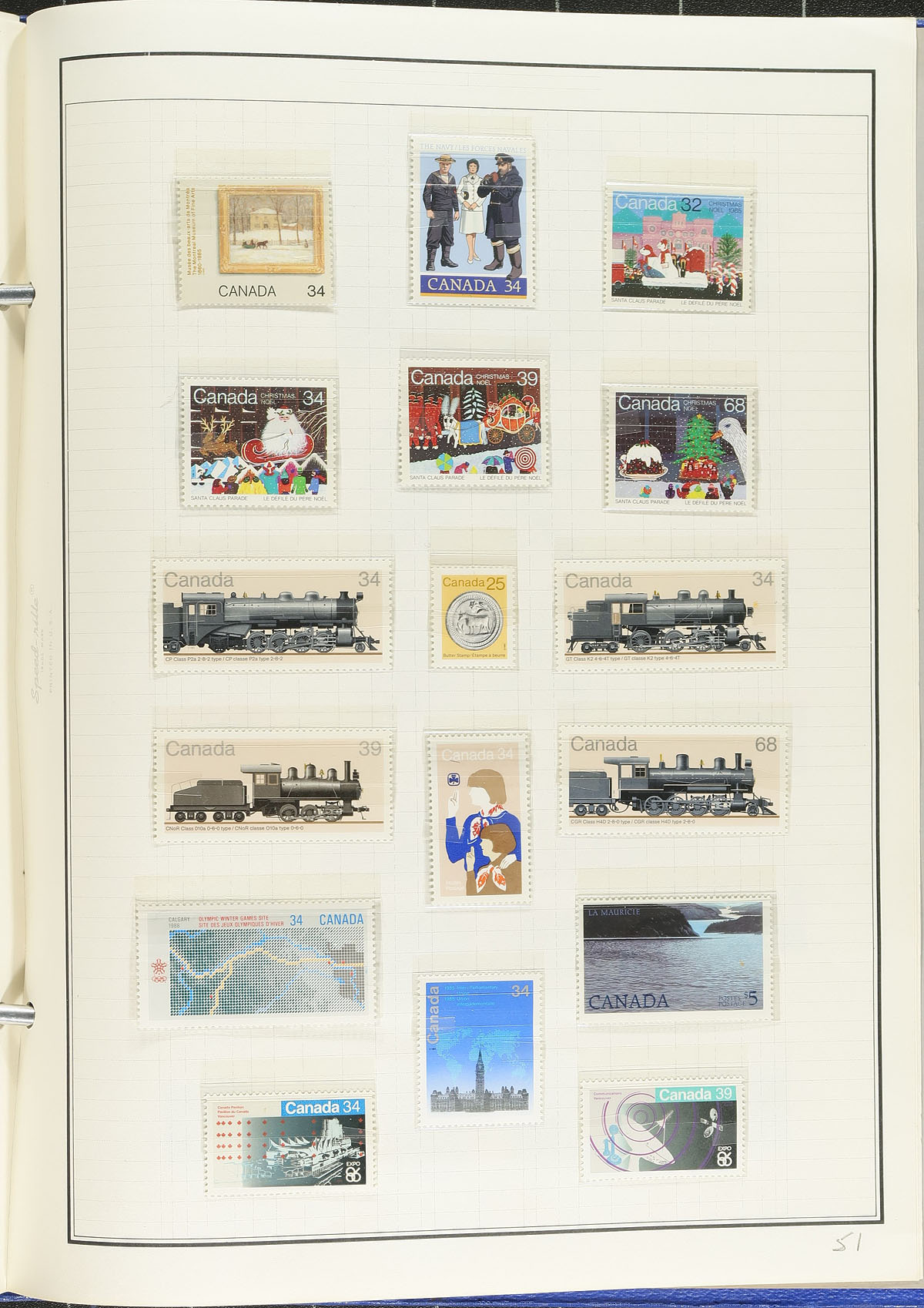 Interesting collection of primarily mint Canada, 1859-1997. The collection ranges from Scott #15/1154, with a selection of used material up to the Admirals, noting #s 15, 29, 20c and 50c (x2) Widow Weeds. The mint material contains singles, sets, and partial sets from the Jubilees onward and includes 5c and 15c Quebecs, Admiral coil singles, complete set of Arch, 1935 and 1938 Pictorials, Medallion, War and Peace issues. Unfortunately, the stamps are in older crystal mounts and a removal test of a few stamps (now seen in black mounts on pages), show varying degrees of staining on the perforations (very light to noticeable). The collection is virtually complete from the 1950's to the 1980's, with roughly $125.00 to $150.00 of usable face value stamps. Still a good collection for Canada collectors, overall fine to very fine. Estimate =