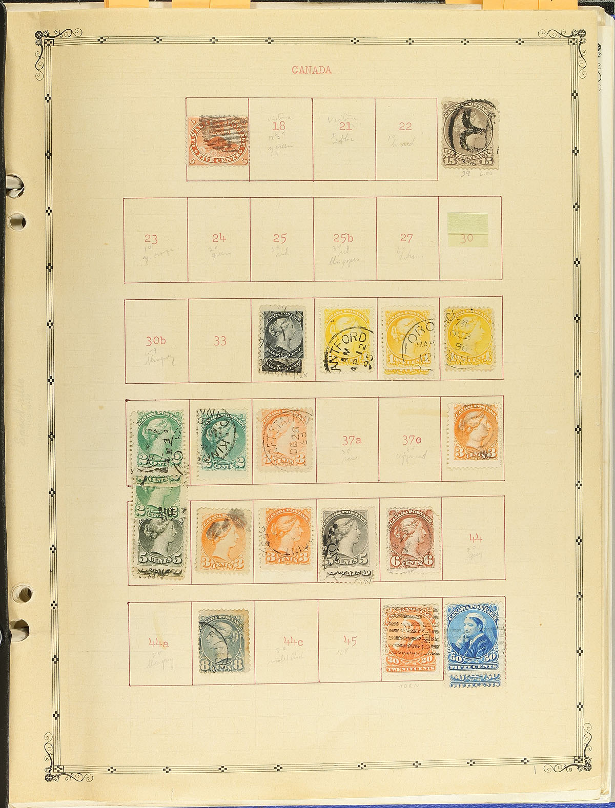 Interesting collection of primarily mint Canada, 1859-1997. The collection ranges from Scott #15/1154, with a selection of used material up to the Admirals, noting #s 15, 29, 20c and 50c (x2) Widow Weeds. The mint material contains singles, sets, and partial sets from the Jubilees onward and includes 5c and 15c Quebecs, Admiral coil singles, complete set of Arch, 1935 and 1938 Pictorials, Medallion, War and Peace issues. Unfortunately, the stamps are in older crystal mounts and a removal test of a few stamps (now seen in black mounts on pages), show varying degrees of staining on the perforations (very light to noticeable). The collection is virtually complete from the 1950's to the 1980's, with roughly $125.00 to $150.00 of usable face value stamps. Still a good collection for Canada collectors, overall fine to very fine. Estimate =