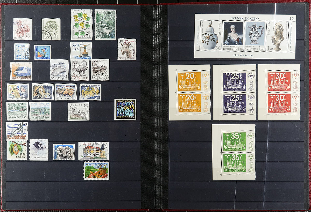 Collection / accumulation of used Sweden, 1858-2008, containing roughly 1,700 stamps in a well organized stockbook and a few stock pages. The lot generally ranges from Scott #8/2578, along with selections of back of the book material, coils, booklet stamps, etc. Owner's 2013 Scott catalogue value for the lot totals US$1,283.00 ($1732.05 CDN), leaving better finds for the dedicated collector. Postmark interest includes cds and bridge types, including several "socked on the nose" town cancels. A nicely organized lot, with duplication up to 5 for some issues, overall fine to very fine. Estimate =
