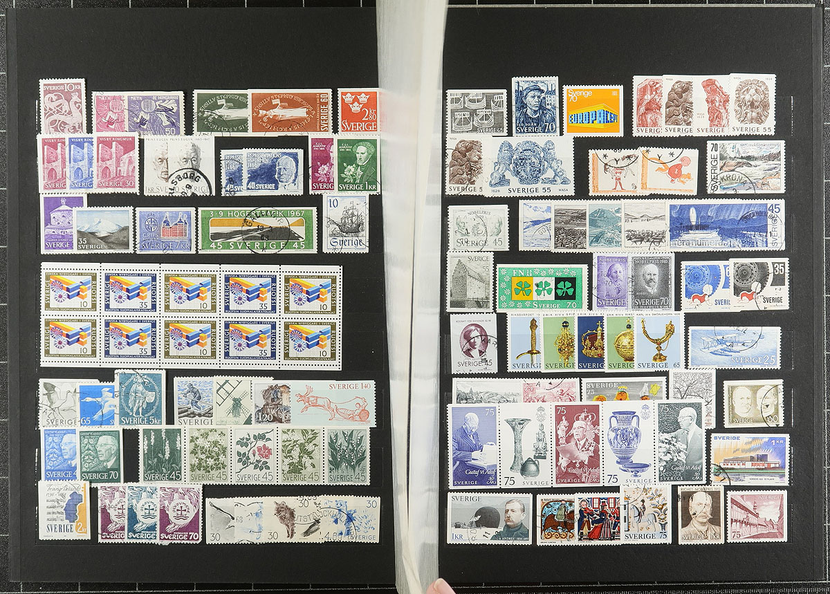 Collection / accumulation of used Sweden, 1858-2008, containing roughly 1,700 stamps in a well organized stockbook and a few stock pages. The lot generally ranges from Scott #8/2578, along with selections of back of the book material, coils, booklet stamps, etc. Owner's 2013 Scott catalogue value for the lot totals US$1,283.00 ($1732.05 CDN), leaving better finds for the dedicated collector. Postmark interest includes cds and bridge types, including several "socked on the nose" town cancels. A nicely organized lot, with duplication up to 5 for some issues, overall fine to very fine. Estimate =